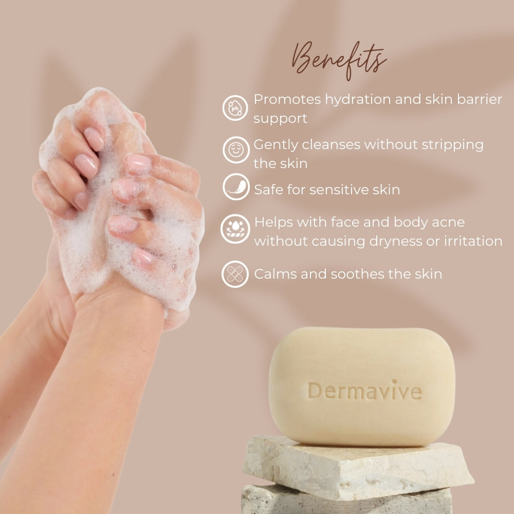 Dermavive Acne and Sensitive Skin Cleansing Bar is a specialised solution for acne-prone sensitive skin, focusing on a gentle and effective cleansing approach. Unlike traditional soaps, this bar is soap-free and pH-balanced, ensuring a thorough cleanse without stripping the skin's natural moisture. The formulation strikes an ideal balance, helping to effectively remove excess oil and impurities without drying the skin. It incorporates the calming and soothing properties of oatmeal, which helps to alleviate redness, itch, and irritation associated with acne.