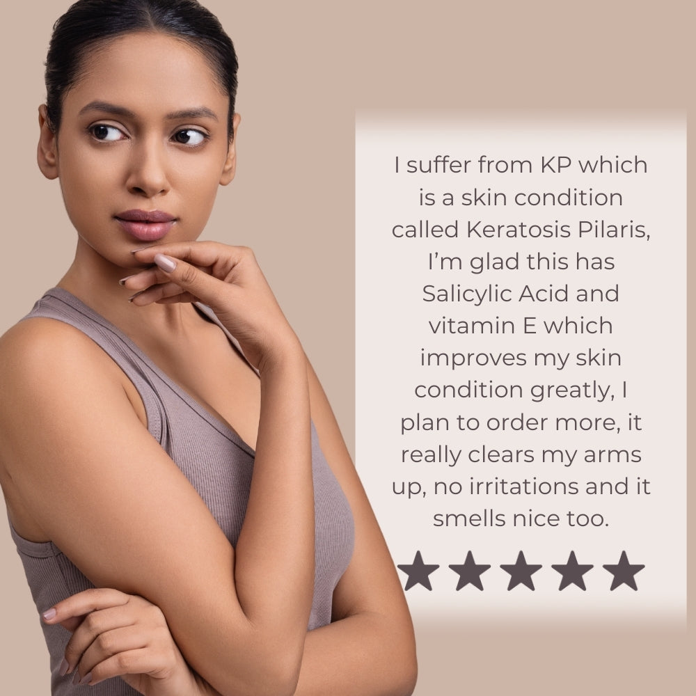 I suffer from KP which is a skin condition called Keratosis Pilaris, I’m glad this has Salicylic Acid and vitamin E which improves my skin condition greatly, I plan to order more, it really clears my arms up, no irritations and it smells nice too.