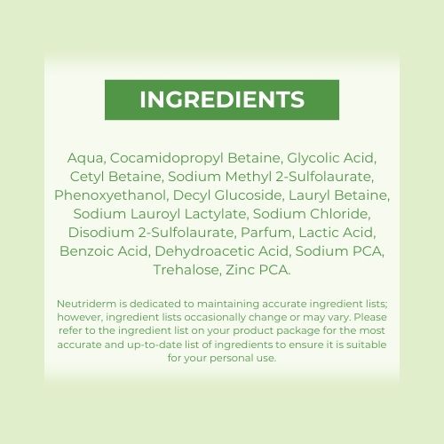 Neutriderm is dedicated to maintaining accurate ingredient lists on our website; however, ingredient lists occasionally change or may vary. Please refer to the ingredient list on your product package for the most accurate and up-to-date list of ingredients to ensure it is suitable for your personal use.
