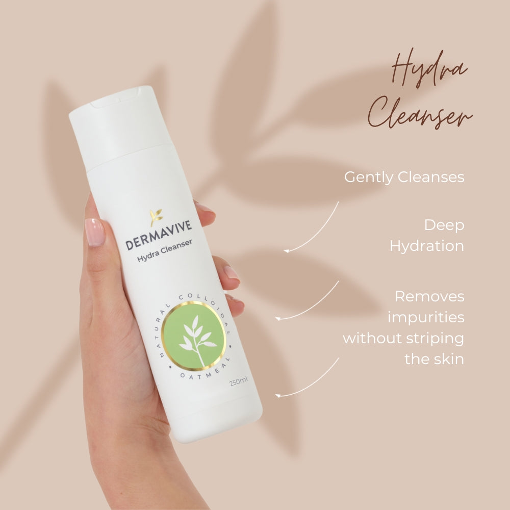 Our Dermavive Hydra Cleanser harnesses the power of natural colloidal oatmeal, enriched with a remarkable component known as Saponins. When you apply this cleanser, these Saponins work harmoniously to gently yet effectively break down and remove dirt, excess oils, and impurities from the skin's surface without stripping away essential oils, which can help the skin not feel dry after cleansing.