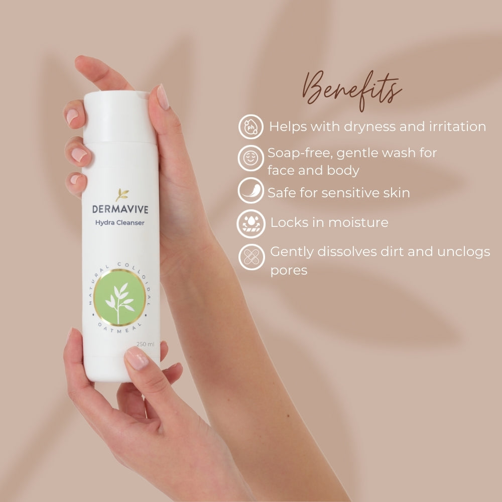Eczema, dermatitis and psoriasis: Individuals with skin conditions like eczema, dermatitis or psoriasis can safely use Dermavive Hydra Cleanser. The colloidal oatmeal helps to soothe itchiness, reduce inflammation and provide relief for these skin conditions.