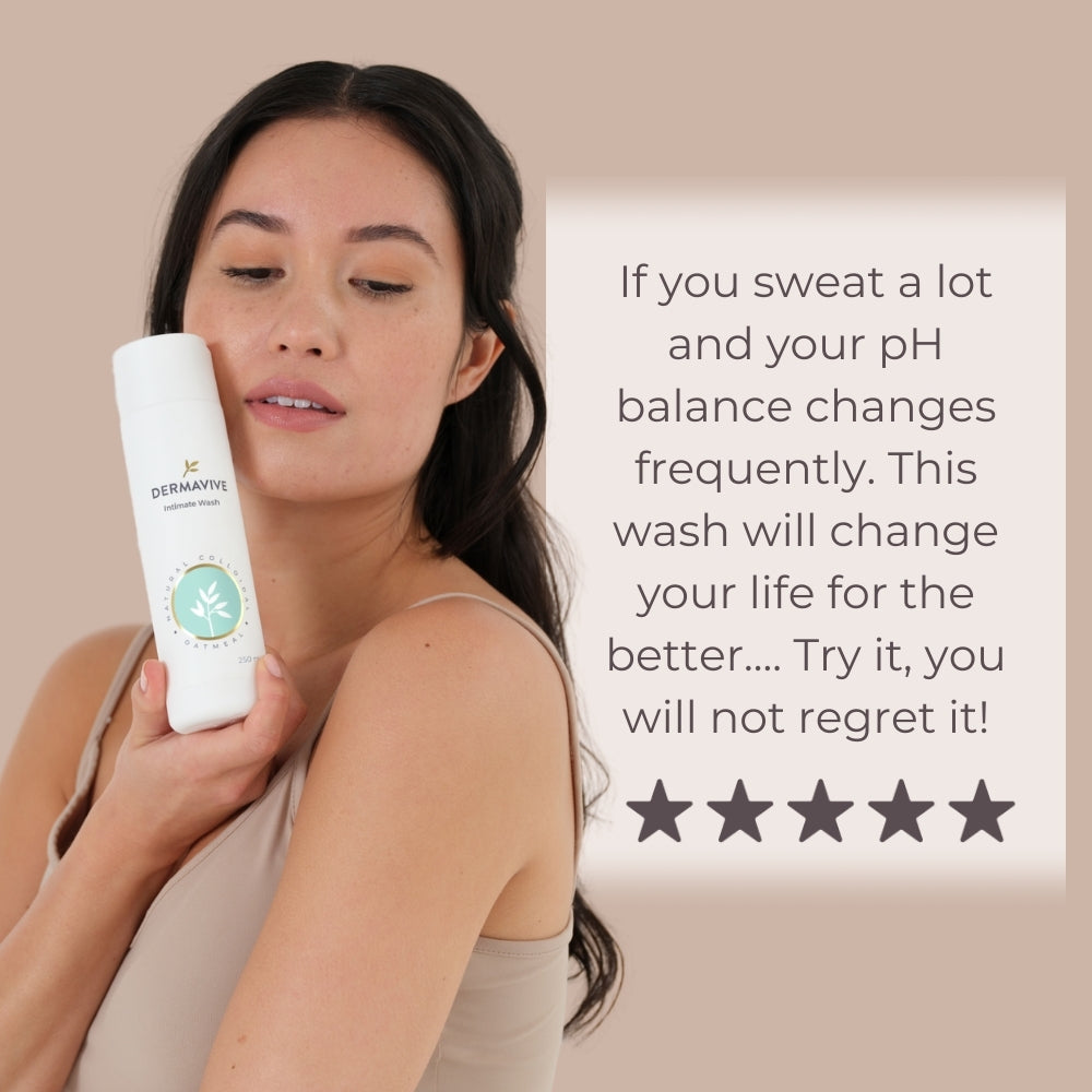 Dermavive Intimate Wash is a dedicated cleanser which helps to address special cleansing and daily hygiene needs of sensitive Intimate skin. It is a pH-balanced formulation comprising Colloidal Oatmeal, Farnesol, Sodium PCA, and Vitamin E. This sting-free formula helps to optimally cleanse intimate skin without causing irritation. It helps support the skin's natural barrier and delivers essential hydration and moisture, leaving the skin feeling fresh and comfortable, particularly in cases of dryness.