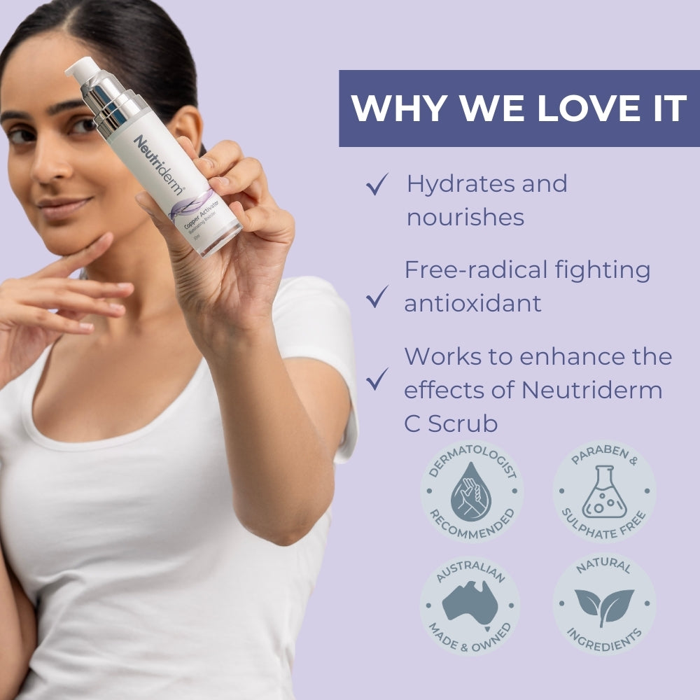Experience the enhanced effects of the Neutriderm Copper Activator. This facial serum supercharges the power of Vitamin C in the Neutriderm C Scrub delivering lifting, firming and brightening benefits to the skin. Copper PCA encourages collagen production while exerting antioxidant power. The active ingredients in this serum work to reduce the visible signs of wrinkles, fine lines and uneven skin tone to reveal a glowing complexion.