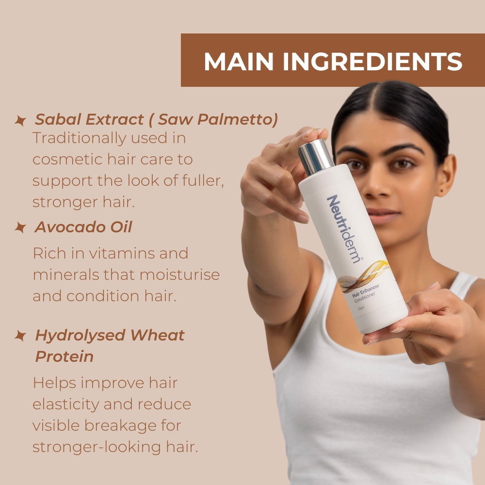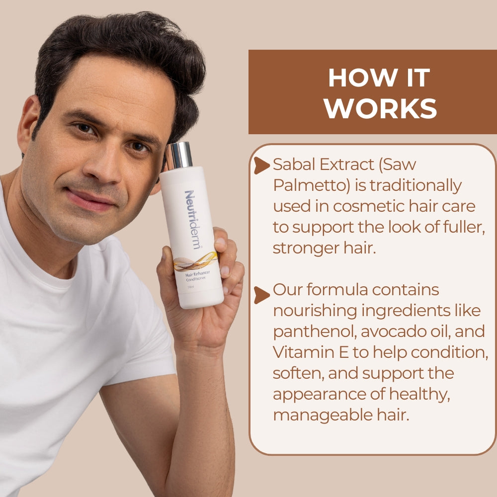 Discover the science of healthy-looking hair with Neutriderm Hair Enhancer Conditioner. This advanced, evidence-based formula is powered by sabal extract (saw palmetto) and a blend of nourishing botanicals, specifically chosen to support scalp health and help hair appear fuller, thicker, and more resilient.